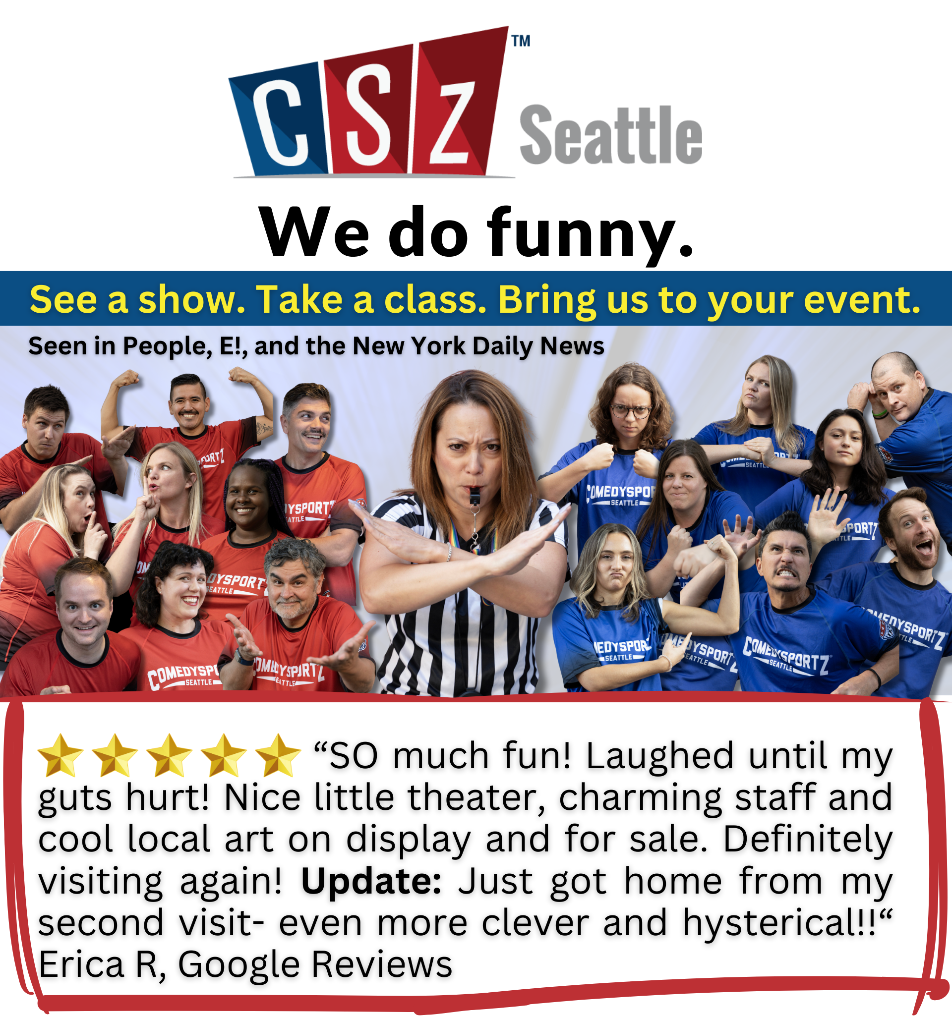 At CSz Seattle we do funny. Our comedians specialize in improv comedy, meaning our shows are based entirely on your suggestions. Our trained comedy professionals have no plan and willingly dive headfirst into almost any challenge the audience will throw at them, resulting in unforgettably hilarious moments. For those reasons, no two CSz shows are ever the same.